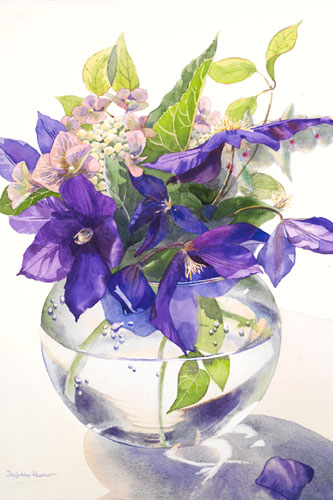 Delphine Poussot is an exemplary artist who deftly combines technique, imagery and personal aesthetic into a seamless whole. She uses watercolors to explore the dazzling light reflecting qualities of flowers, leaves, and fruit, as they interact with water, glass and other reflecting surfaces. Her vision is one of fullness and vitality and her work is elegantly delightful.